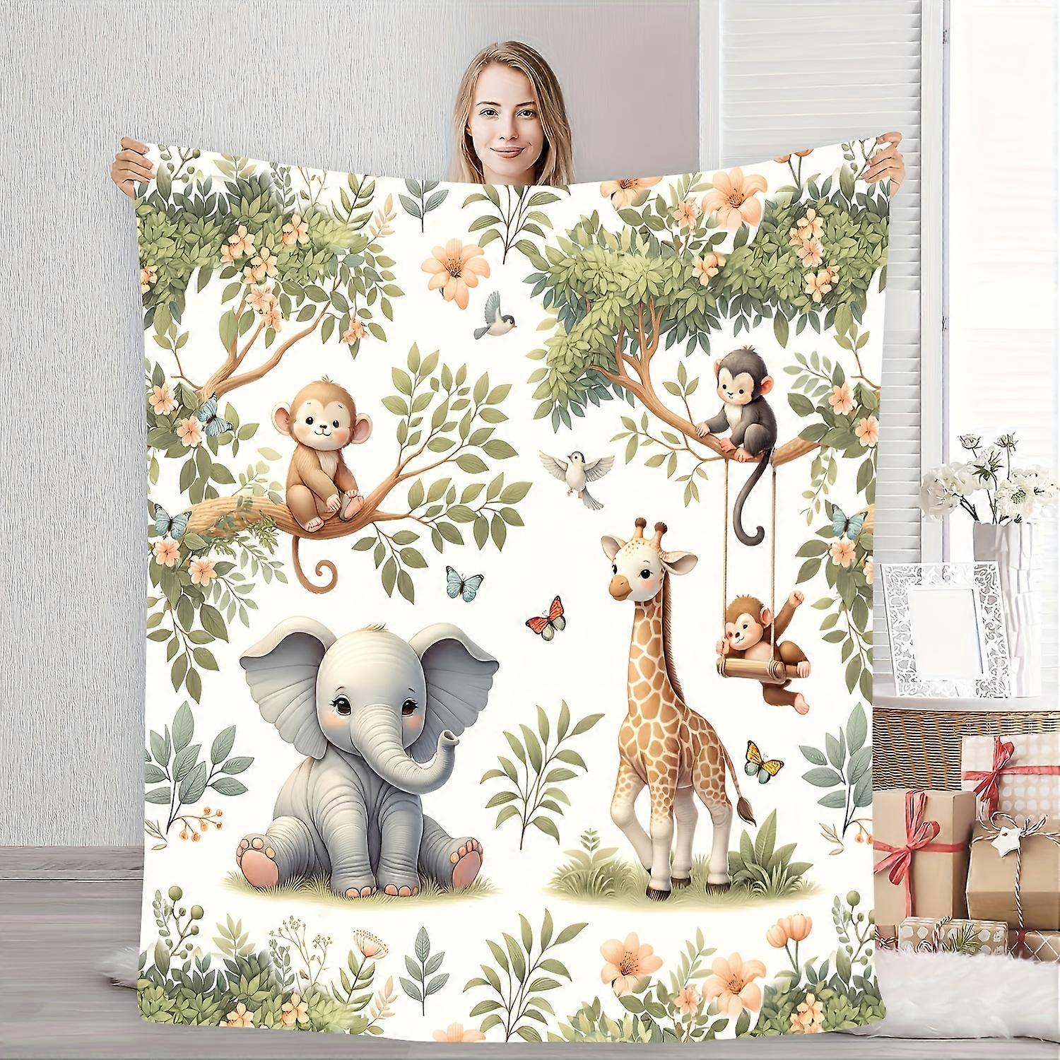 Spring Animal Flannel Blanket - Cute Elephant/Giraffe Print, Warm Throw for Camping/Home, Perfect Gift for Family & Best Friends