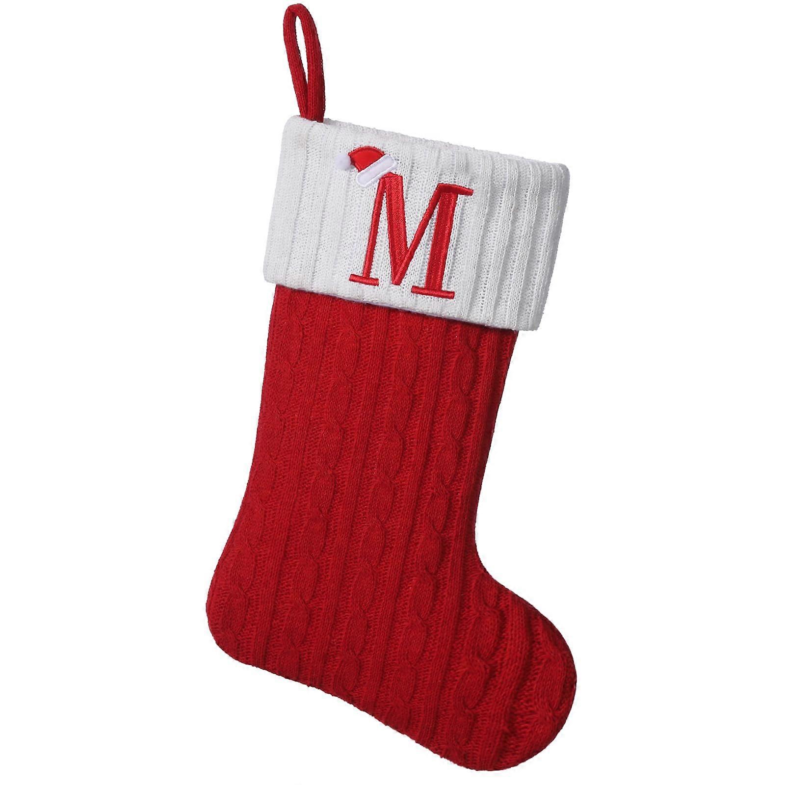 Red Knit Christmas Stocking with Embroidered Initial M, 19.5 Inch Fireplace Decor