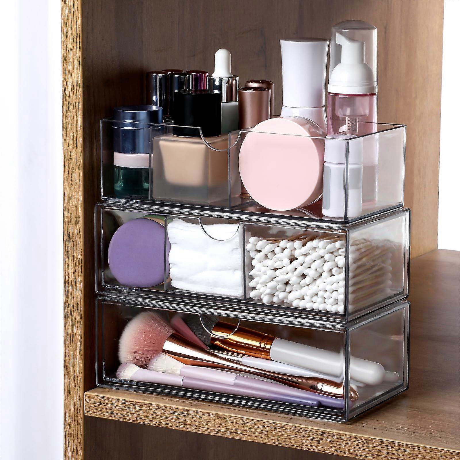 3 Pack Acrylic Storage Organizer with Removable Dividers, Stackable Medicine Cabinet Drawer for Bathroom, Vanity, Closet