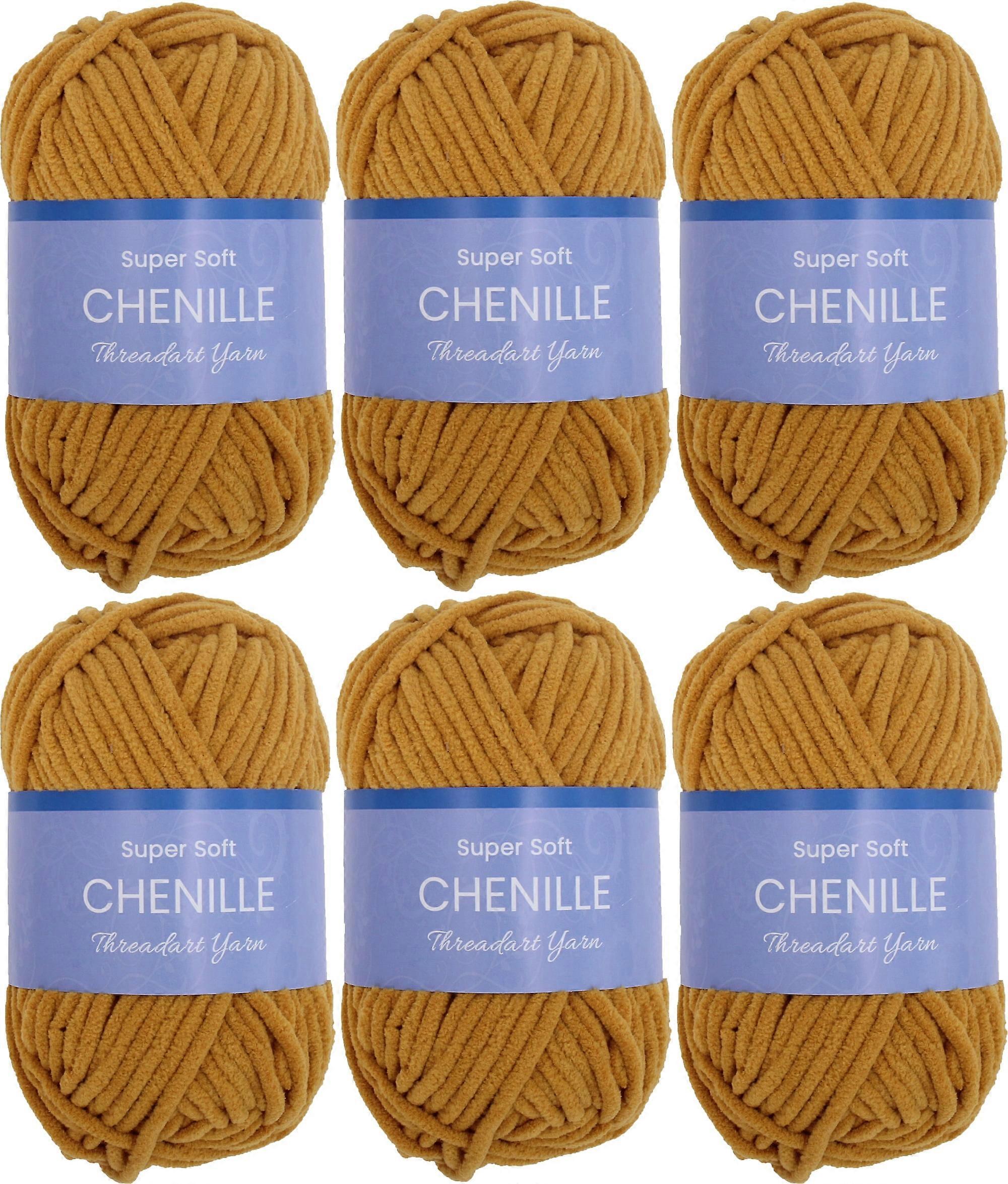 6 Pack ThreadArt Chenille Yarn for Crocheting, Knitting, Amigurumi, Super Soft Plush Velvet Yarn - 50 Gram 60 yds #5 Fluffy Yarn Skeins - Mustard