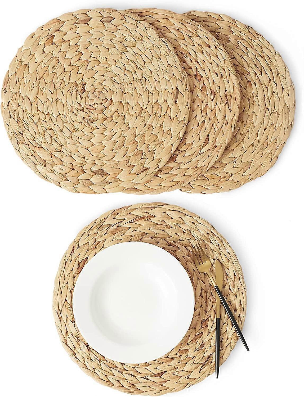 MODANU 4 Pcs 15" Natural Water Hyacinth Round Placemats, Braided Rattan Wicker Table Mats for Dining, Wedding, Parties, BBQ, Holidays