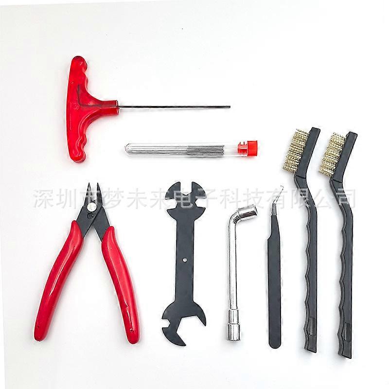 3D printer nozzle cleaning kit with nozzle removal and installation tools and cleaning needle brush.