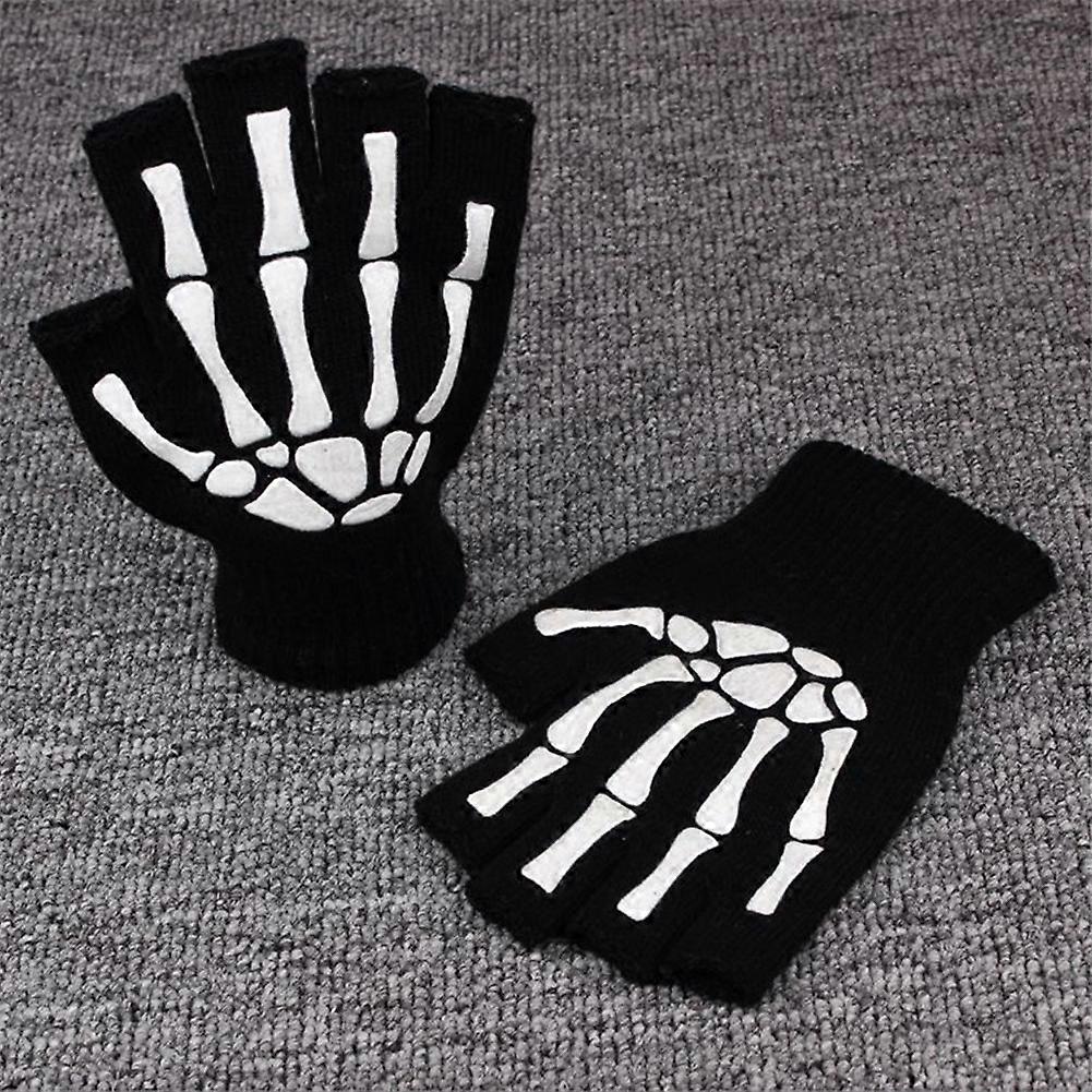 Punk Gloves Unisex Halloween Skeleton Skull Half Finger Gloves Fingerless Stretch Knitted Mittens Winter Skull Gloves