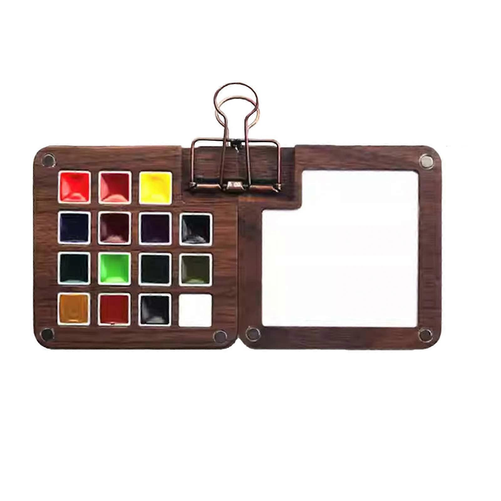 ShunRuiPi Watercolor Paint Set, 15 Grids Portable Mini Walnut Wood Watercolor, Detachable for Adults Kids Hobbyists, Compatible with Watercolor Paper