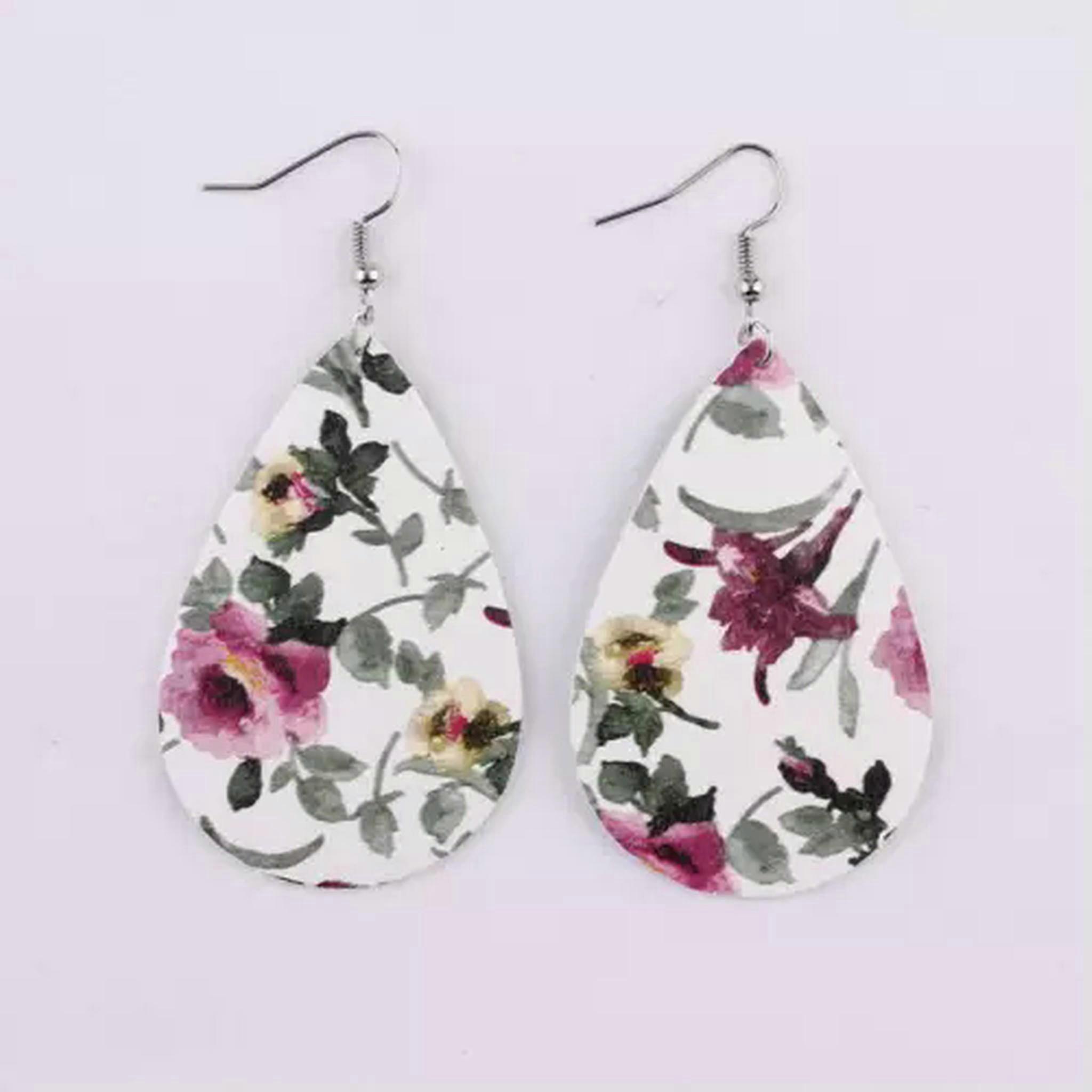 RSAMD Printed Rose Petunia Floral Teardrop Leather Statement Women Waterdrop Earrings-Fuchsia