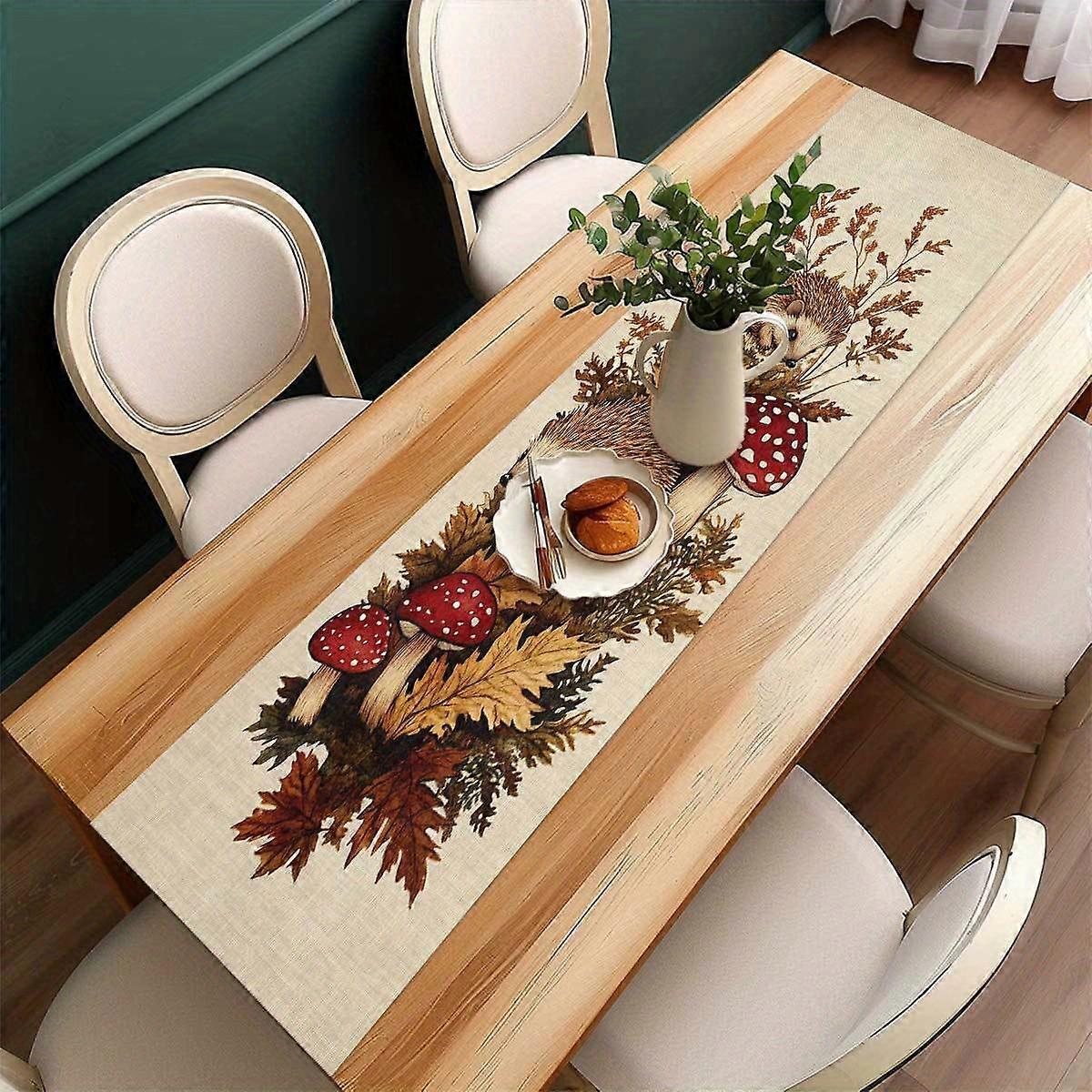 1pc Rustic Nature Table Flag - Charming Hedgehogs with Mushrooms and Autumn Foliage, Cozy Natural Atmosphere for Home Decor