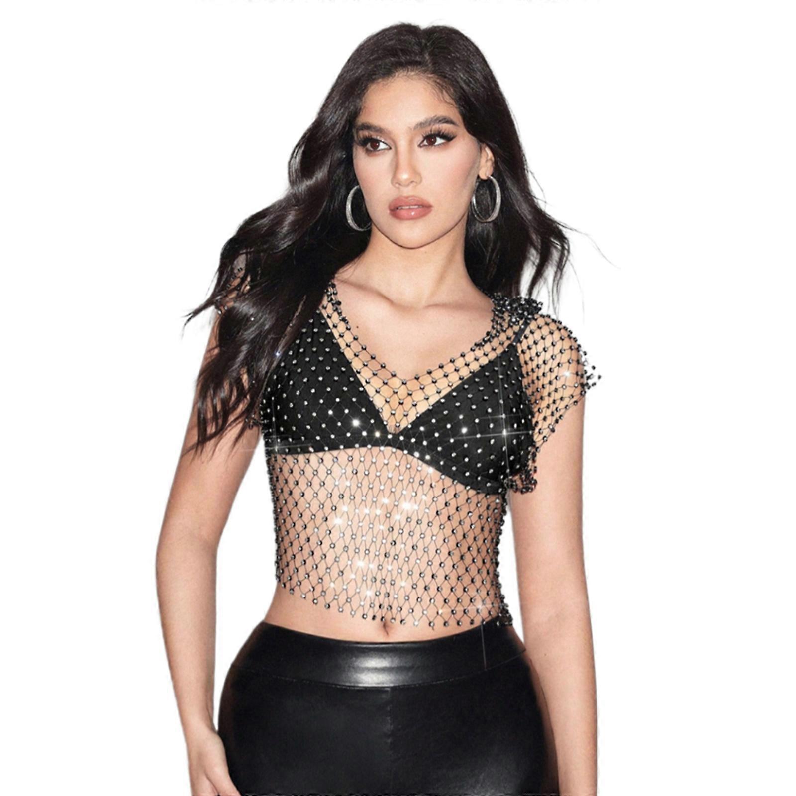 Women Sparkly Rhinestones Sheer Mesh Crop Tanks Top Glittering Body Jewelry Cover Up Sleeveless Hooded Vest Clubwear Black X S