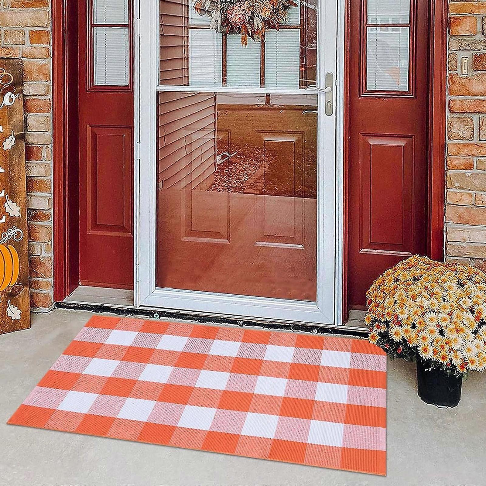 Fnochy Halloween Door Mat 23.6"x35.4", Fall Decor Buffalo Plaid Outdoor Rug, Farmhouse Checkered Layered Welcome Mat for Entryway, Orange and White