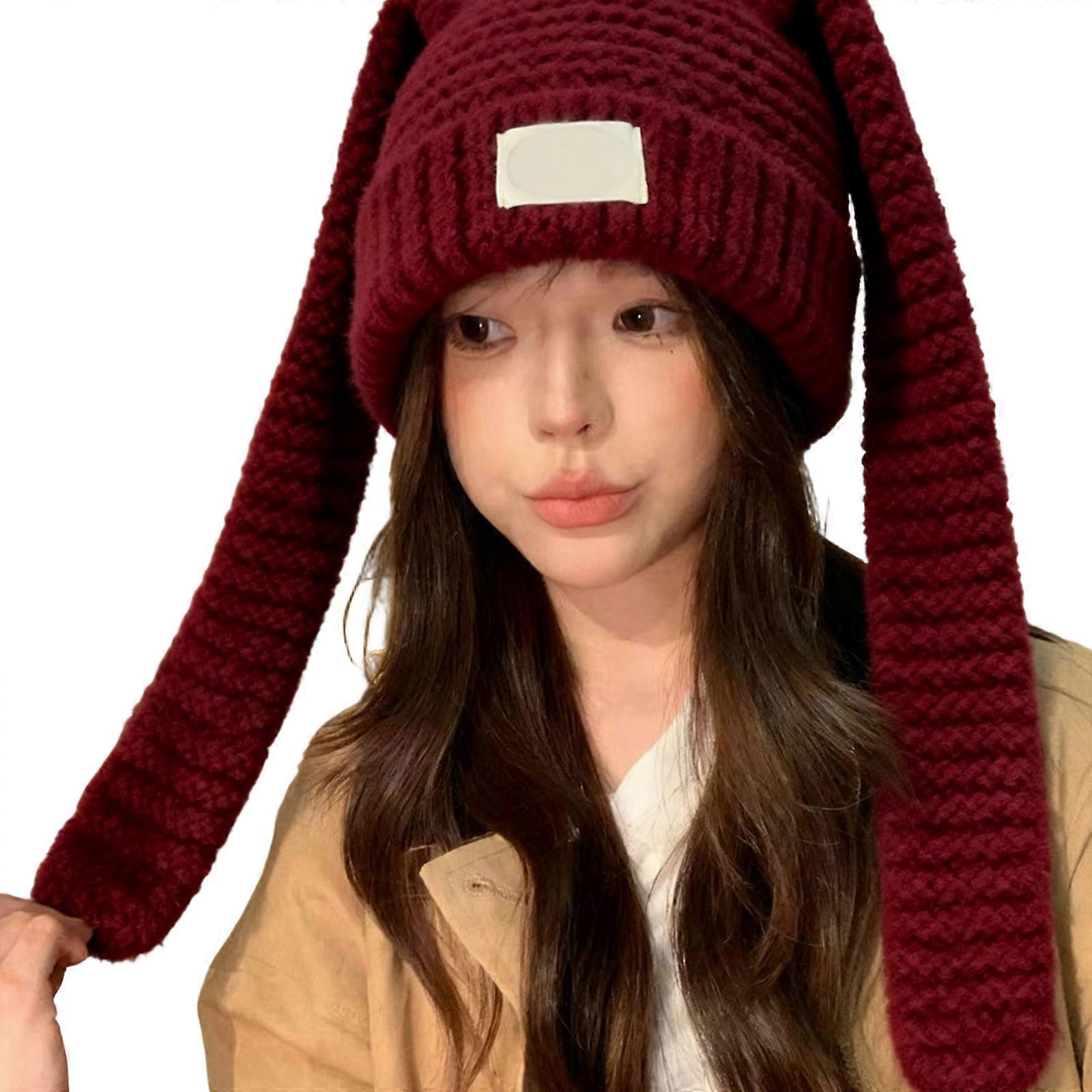 Pullover Soft Long Ear Hat Warm Headwear for Women Winter Cycling Climbing Skiing Pullover Ear Hat Thick Lining Burgundy