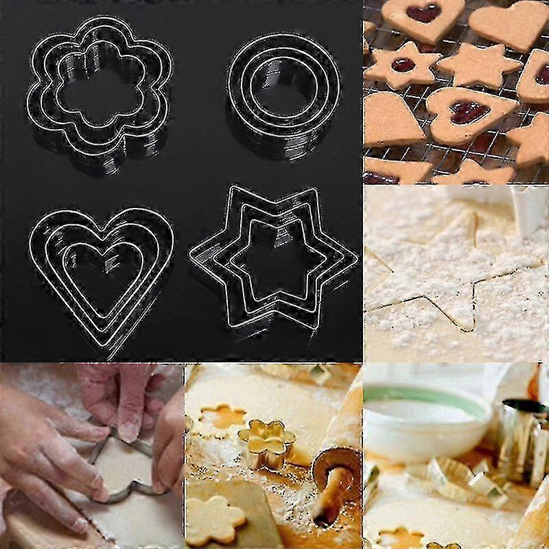 12-piece cookie cutter set, including round, star, heart, and flower shapes, for DIY cake decorating.