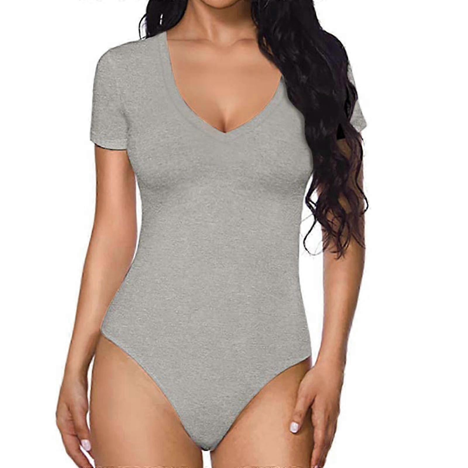 Women Summer Deep V-Neck Short Sleeve Thong Bodysuit T-Shirt Basic Solid Color Bodycon Jumpsuits Romper Top Streetwear light grey S