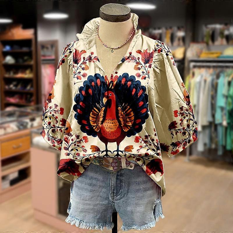 Cherrybetty Thanksgiving Floral Turkey Print Puff Sleeve Top Women's Casual Fashion Shirt Everyday Wear Blouses cute fall outfits lady chit
