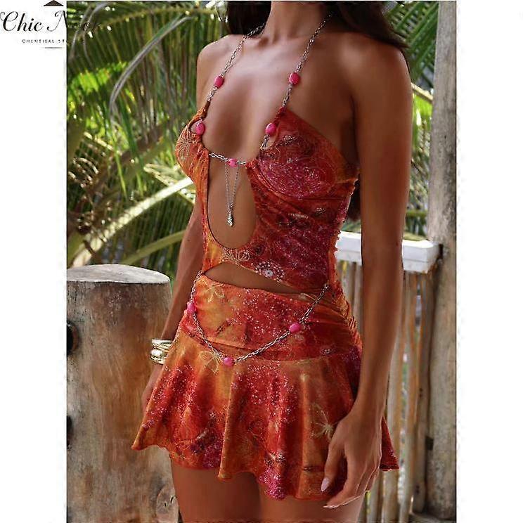 Womens Print Mesh Sheer Skirt Outfits Contrast Color Hollow Out Halter Top Mini Wrap Skirt Vacation Sets