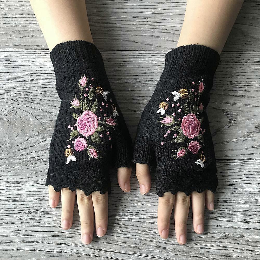 Handmade Flower Embroidered Gloves Women Fingerless Knit Gloves Autumn Winter Cold proof Writing Gloves INS Embroidered with Bee