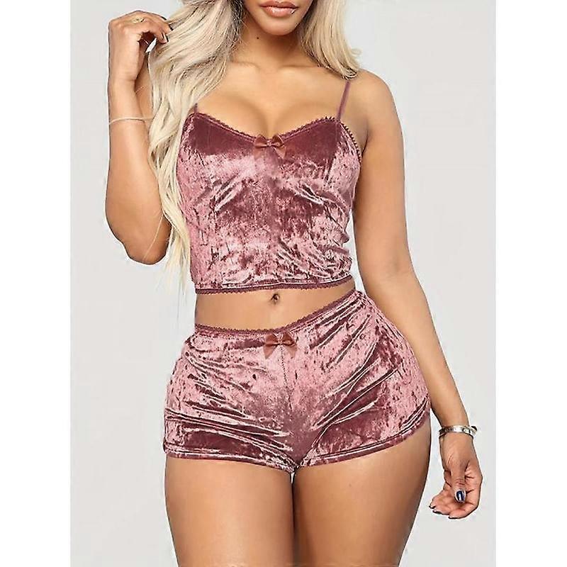 Women's Minimalist Bow Decor Velvet Two-Piece Set, Lady Casual Comfort Crop Cami Top & High Waist Modesty Shorts for Summer, Casual Summer O