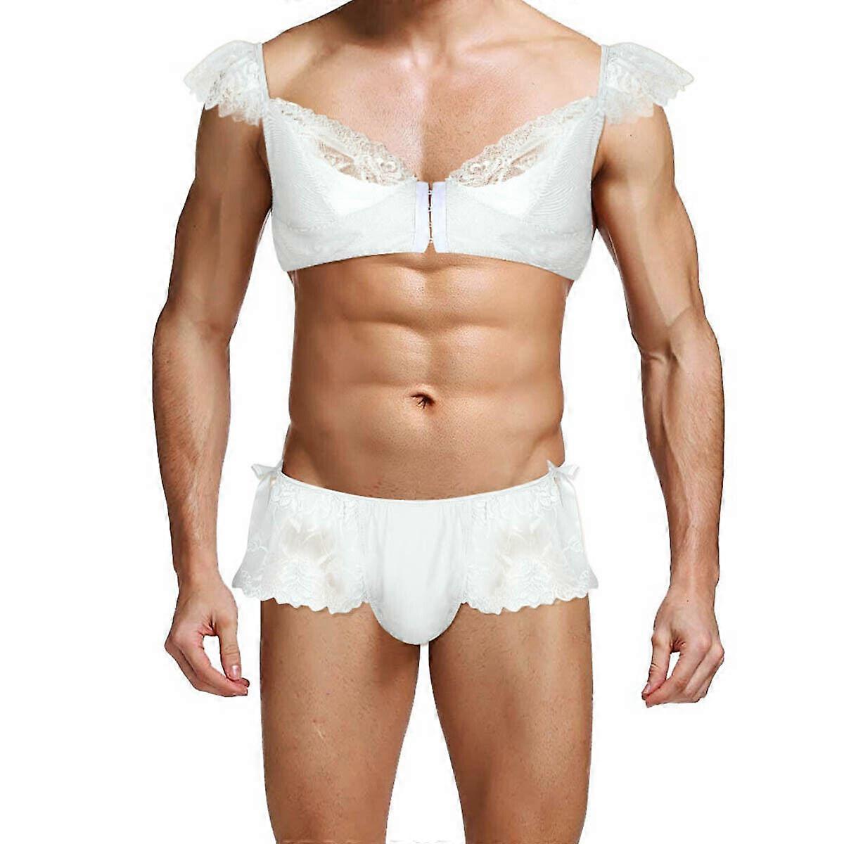 Men's Satin Lace Sissy Lingerie Set Cap Sleeves Bra Top Bikini Briefs Underwear