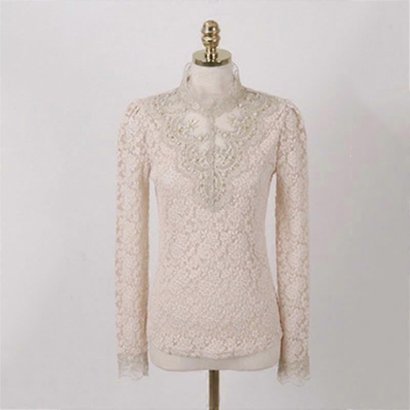 Ladies Floral Lace Mesh Slim Shirt Blouse Beaded Embroidered Collar Elegant Tops