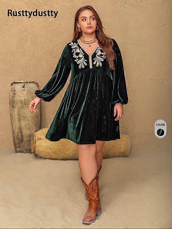 ��Plus Size�� Embroidered V Neck Lantern Sleeve Evening Dress, Elegant Bishop Sleeve Knee Length Dress for Party Holiday Wedding Guest, Women'