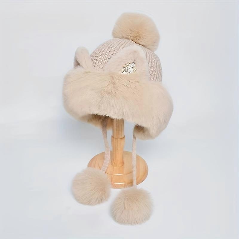 Women's Faux Fur Cat Ear Beanie with Glitter Accents -Thick Warm Skull Cap, Elastic Cuffed Windproof Winter Hat, Plush Pom-Pom