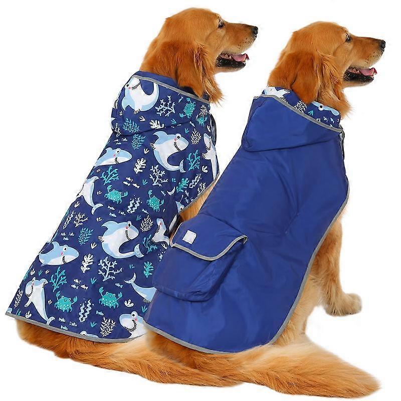 HDE Reversible Dog Raincoat with Hood, Back Pocket, and Reflective Design - Sharks Print for Small to XXL Dogs Adjustable Waterproof