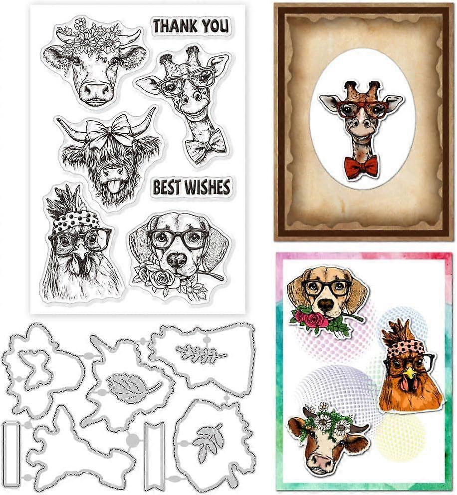 Funny Farm Animal Clear Stamps and Cutting Dies Dog Cow Chicken Giraffe Silicone Clear Stamps and Metal Die Cuts for Card Making Embossing Scrapbookin