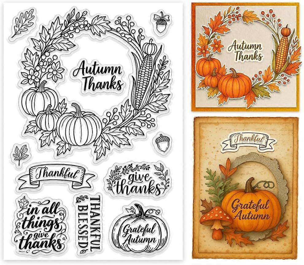 1 Sheet Clear Stamp Autumn Wreath Pumpkin Transparent Rubber Stamps Reusable Silicone Clear Stamp Seals for Card Making Scrapbooking Embossing Album D