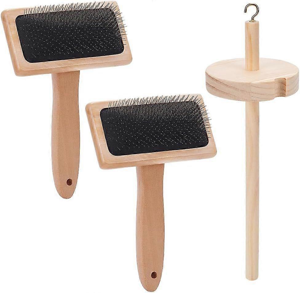 2Pcs Wool Brush with Wood Spindle Wheel Wool Carders Slicker Brush Needle Felting Brush with Solid Wood Handle for Yarn Weaving Blending Roving Craft