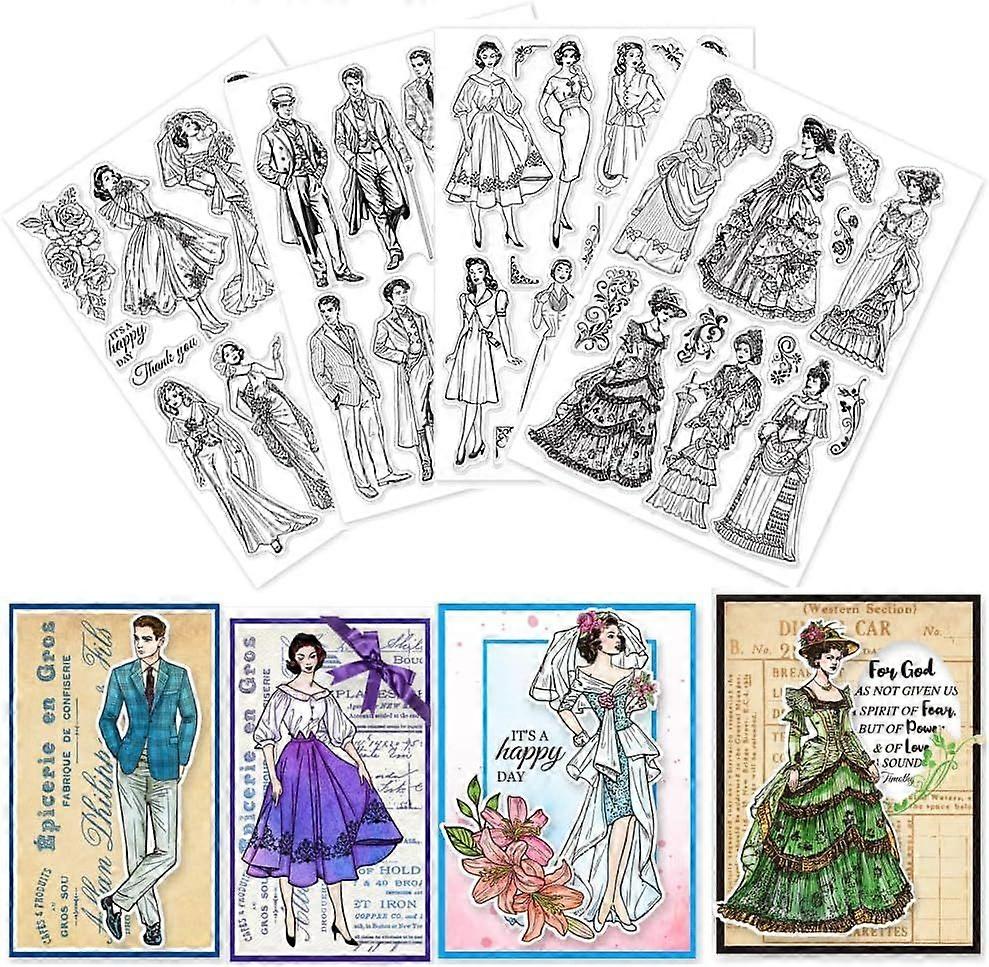 4 Sheets Vintage Men and Women Clear Stamps for DIY Scrapbooking Retro Lady and Gentlemen Silicone Clear Stamp Seals Transparent Stamps for Cards Maki