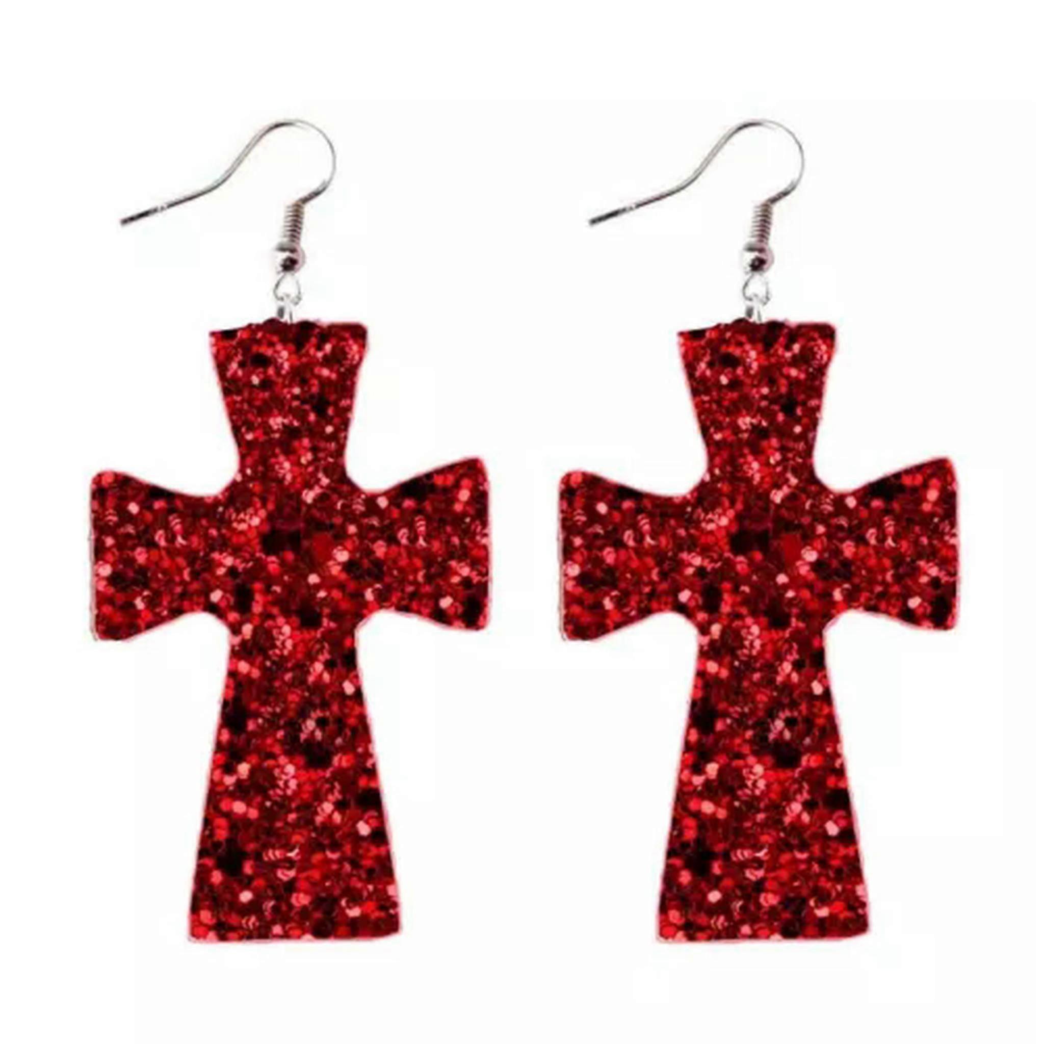 RSAMD Glitter Sequins Leather Cross Dangle Earrings for Women Classic Party Jewelry-Red