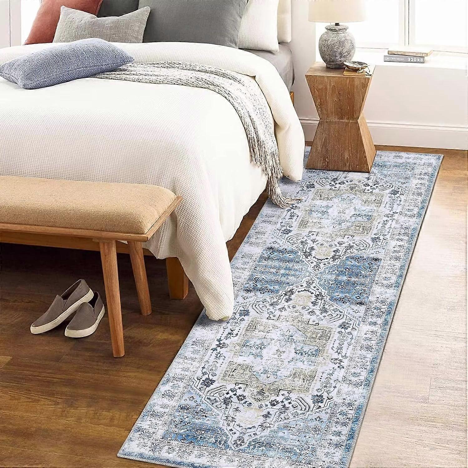 Garvee 2' x 10' Hallway Runner Rug Vintage Persian Rug Indoor Floral Pattern Distressed Carpet Bedsides Thin Rug Chenille Mat for Kitchen, Blue