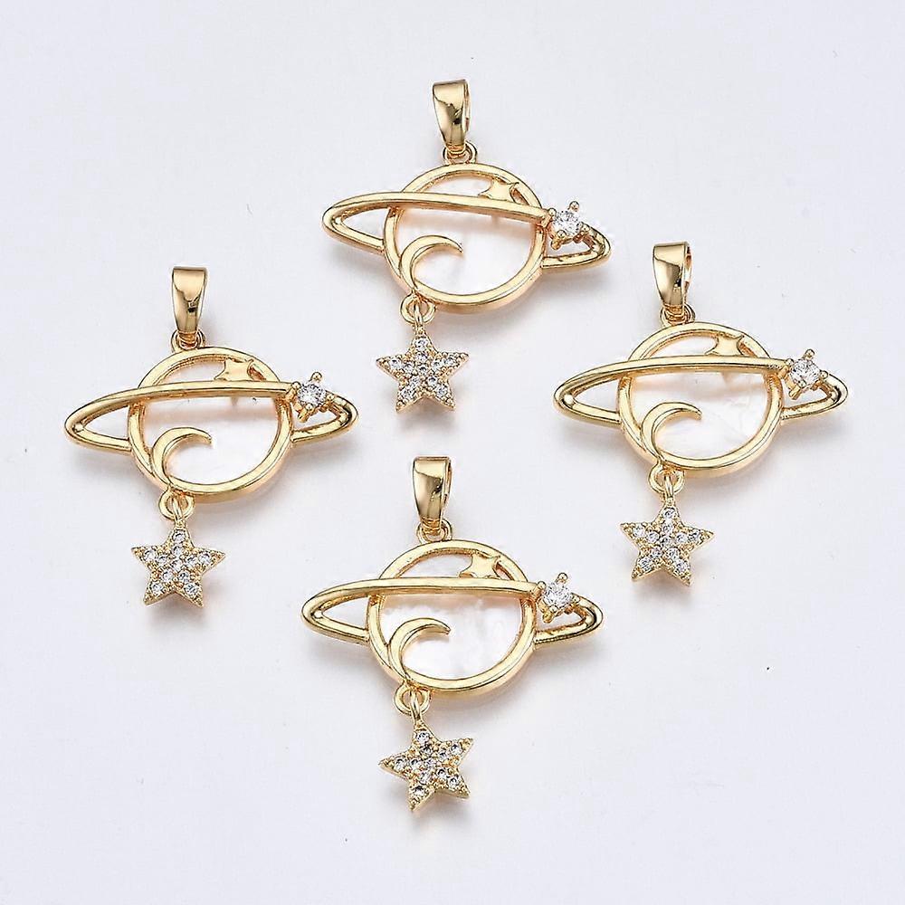 1pc Brass Micro Pave Clear Cubic Zirconia Pendants, with White Sea Shell, Nickel Free, Planet with Star, Real 18K Gold Plated, 24x22x4.5mm, Hole: 2.5x4.5mm, Planet: 16x22x4.5mm, Star: 9x7x1.5mm Material: Natural Sea Shell, Brass, Cubic Zirconia Color: White Metal Color: Real 18K Gold Plated Shape: Planet Usage: Pendants