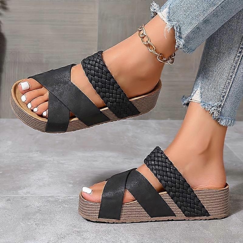 Thick Sole Platform Summer Slide Sandals - Chic Women's Casual Open Toe Shoes with Braided Detail, Cross-straps, Solid Colors, Woven Bag