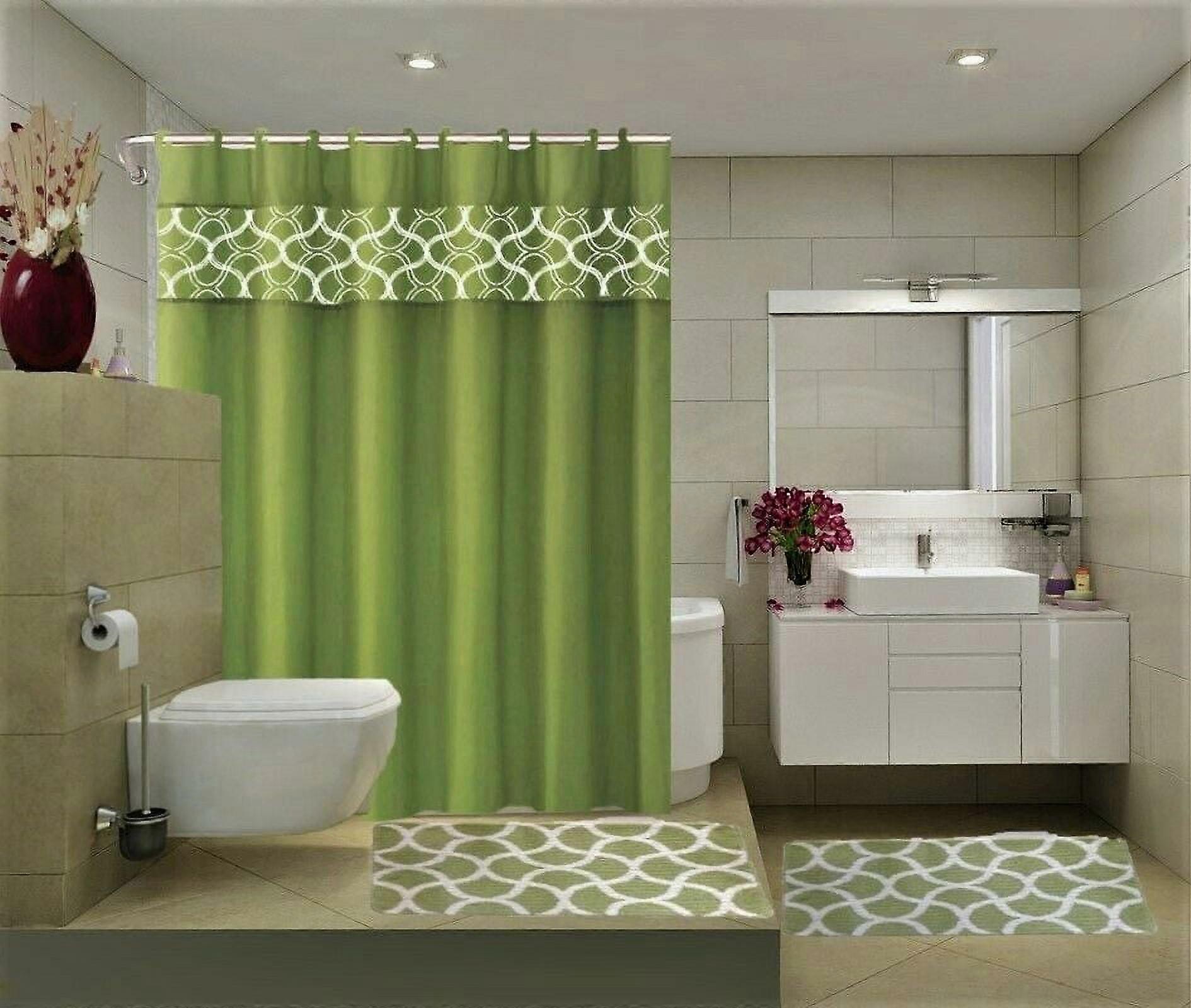 15-Piece Bathroom Set : 2-Rugs/Mats, 1 -Fabric Shower Curtain, 12-Fabric Covered Rings Non Slip Rugs Home Décor Geometric Sage