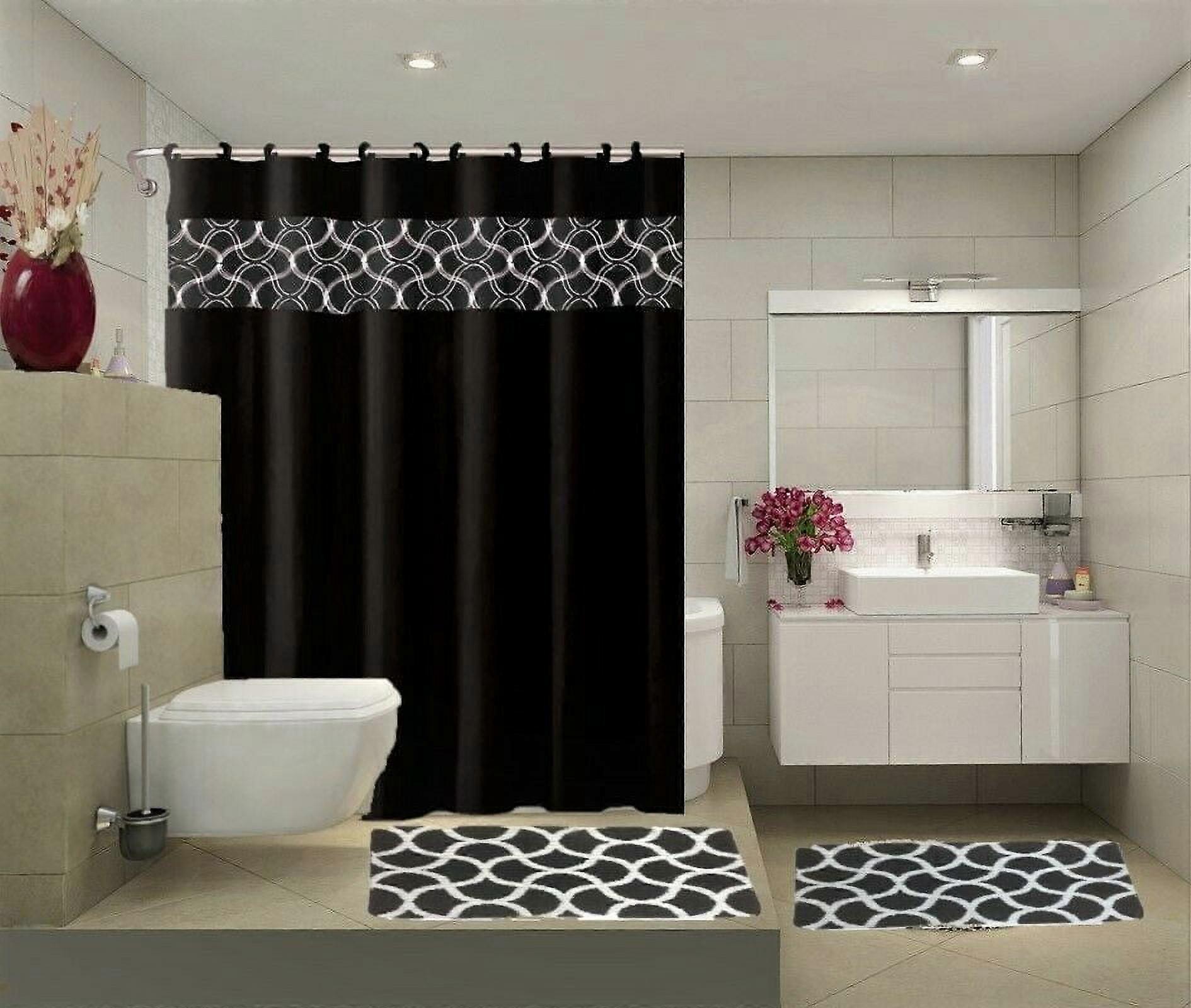 15-Piece Bathroom Set : 2-Rugs/Mats, 1 -Fabric Shower Curtain, 12-Fabric Covered Rings Non Slip Rugs Home Décor Geometric Black
