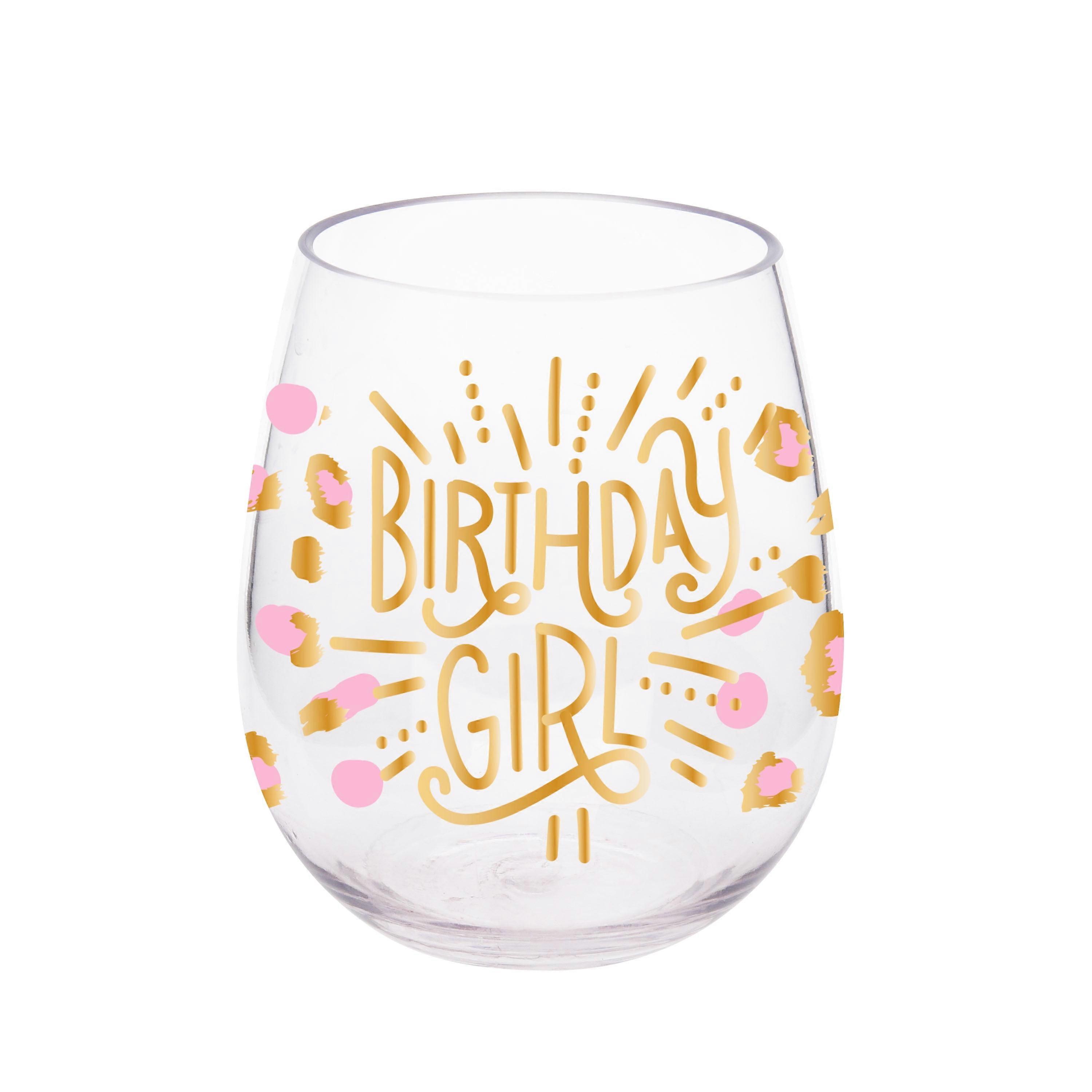 Way to Celebrate Acrylic 17.5-Ounce Stemless Wine Glass, Pink & Leopard, Birthday Girl