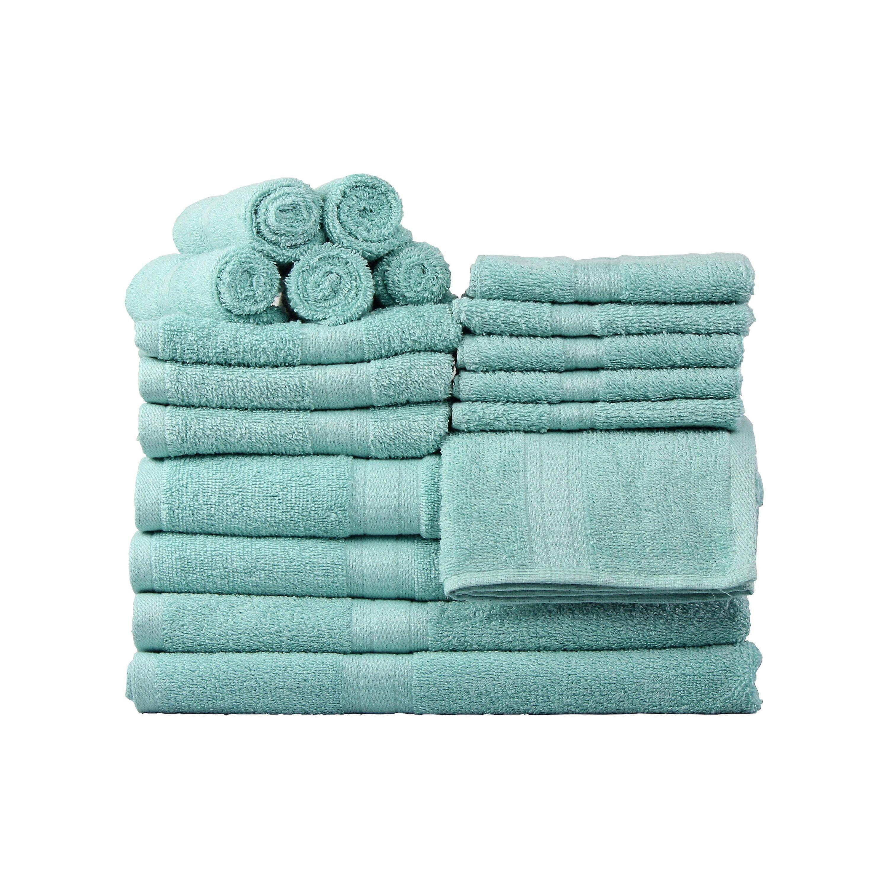 Mainstays 18-Piece 100% Cotton Towel Set (4 Bath, 4 Hand, 10 Washcloths), Super Soft & Absorbent, Solid Color – Aqua
