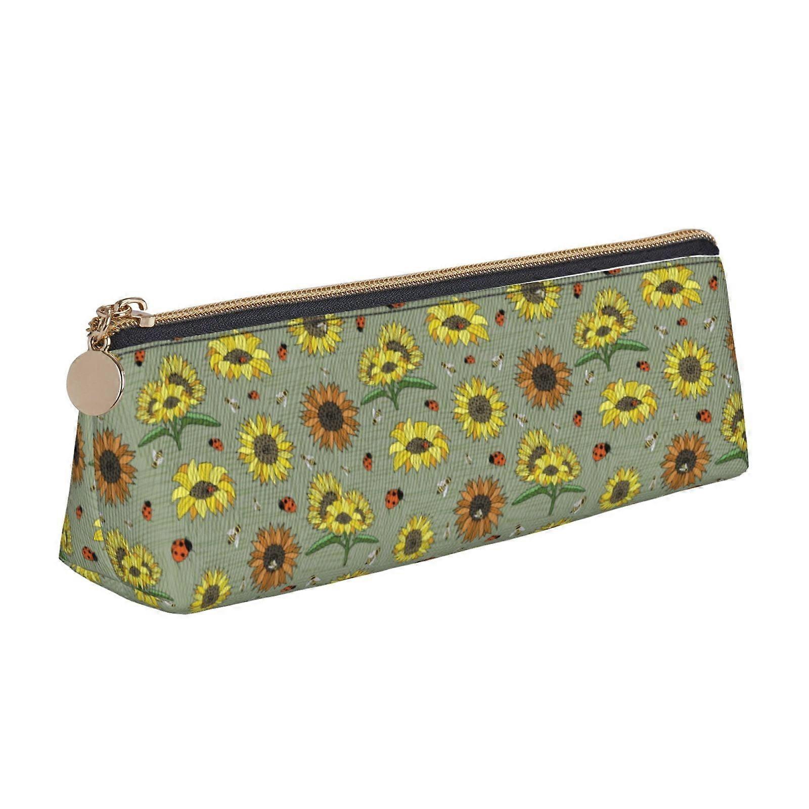 Cute Bee and Sunflower Pattern Pencil Case with Zipper Leather Pen Pouch Storage Bag Cosmetic Organizer Bag
