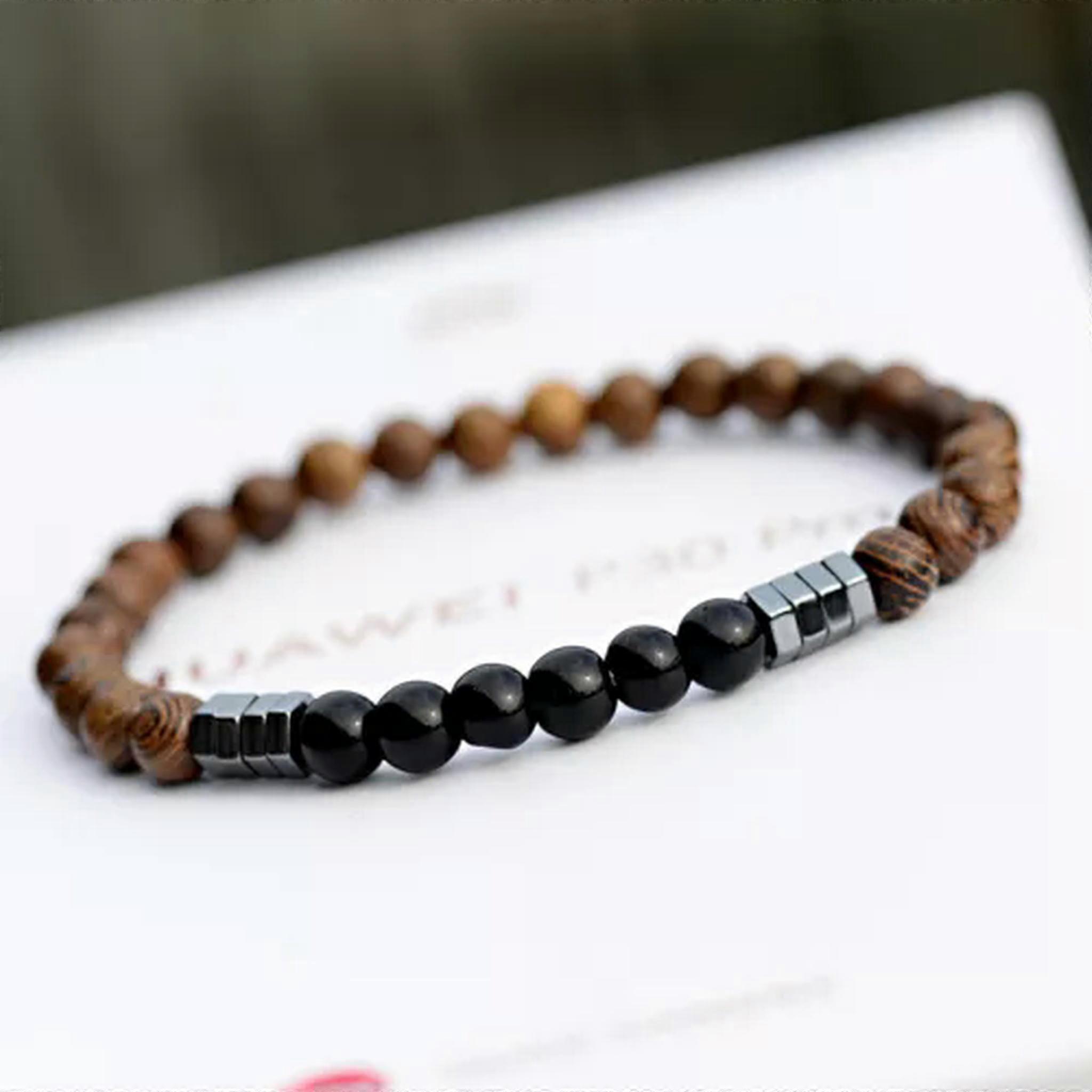 RSAMD Fashion Women Men's Natural Wood Beads Hematite Charm Elastic Strand Bracelets-Agate