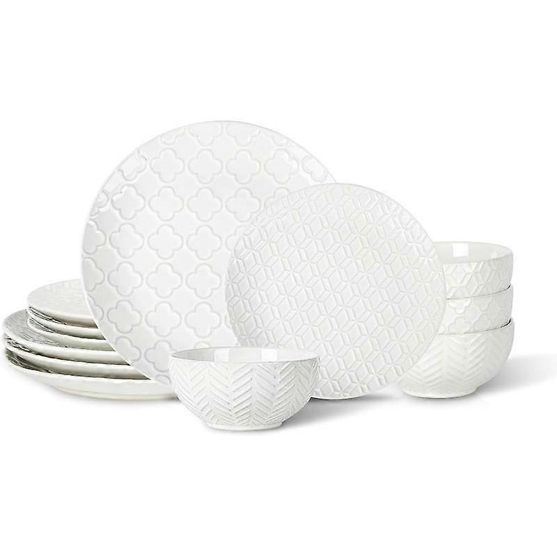 12- Ceramic Dinnerware Set for 4 - Embossed Plates and Bowls Sets, Scratch Resistant Dish Set, Microwave, Oven Dishwasher Safe, White