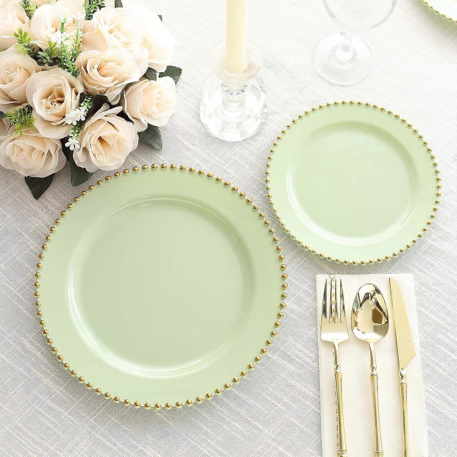 Efavormart 10 Pack Sage Green Plastic Dinner Plates with Gold Beaded Rim, Round Disposable Party Plates - 10"