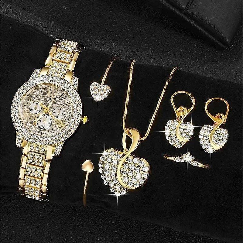 6count Gorgeous Style Women's Alloy Steel Band Quartz Watch with Diamond Set, Three Eyes Roman and Alloy Gold Jewelry Set, Heart Point Diamo