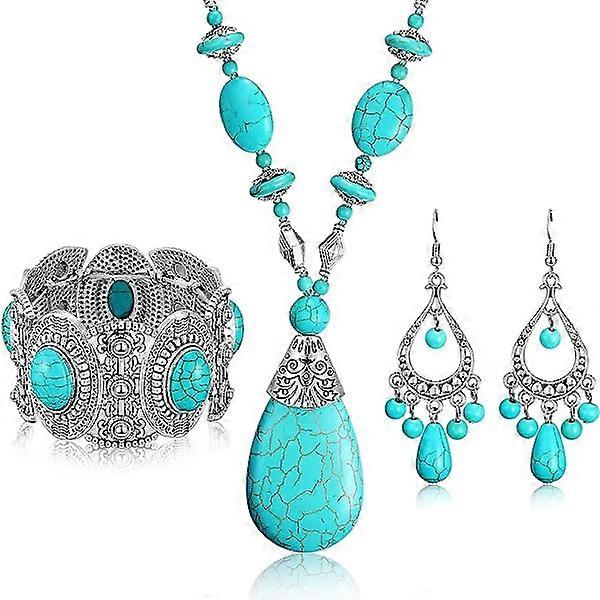 3-piece bohemian turquoise jewelry set for women, western jewelry set with turquoise pendant, vintage turquoise dangle earrings