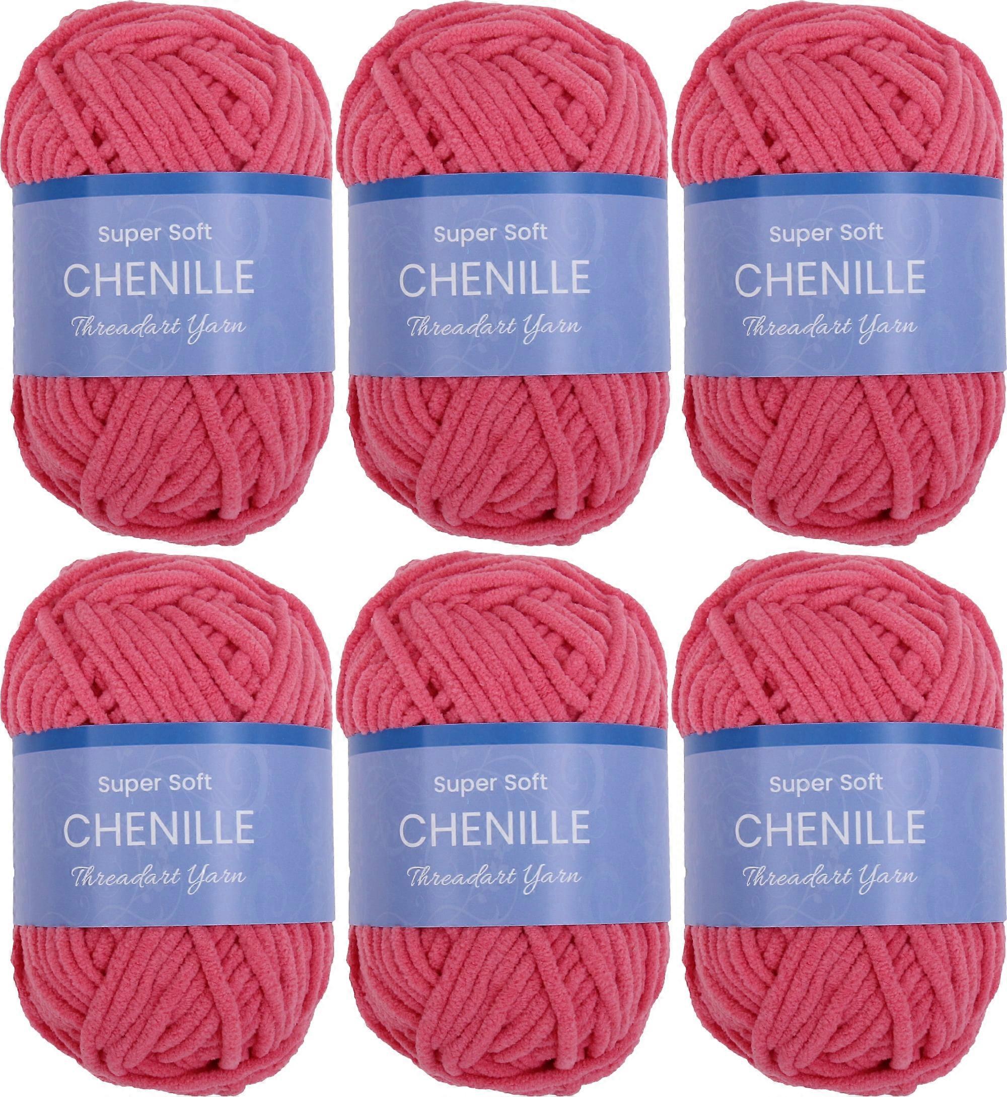 6 Pack ThreadArt Chenille Yarn for Crocheting, Knitting, Amigurumi, Super Soft Plush Velvet Yarn - 50 Gram 60 yds #5 Fluffy Yarn Skeins - Bright Pink