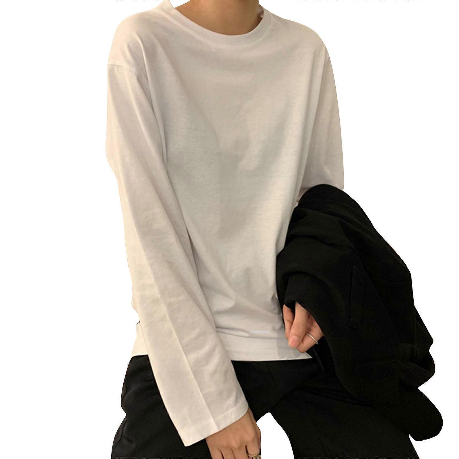 Womens Korean Style Fall Long Sleeve Blouses Pullover Tunic Top Solid Color Round Neck Casual Loose Basic T-Shirts White XL