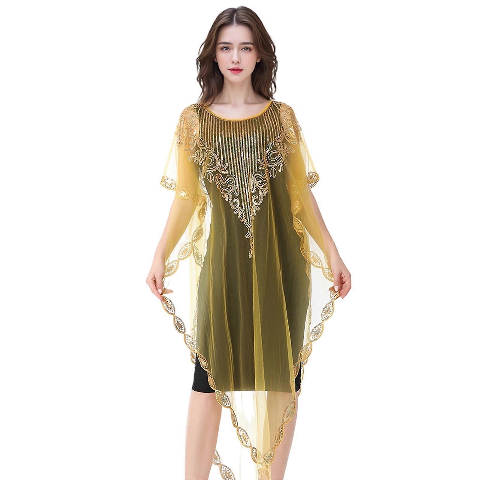 Women's Sequins Embellished Dress Overlay Long Cape Shawl for Parties with Batwing Sleeves Sheer Mesh Flapper Cover Up Yellow os
