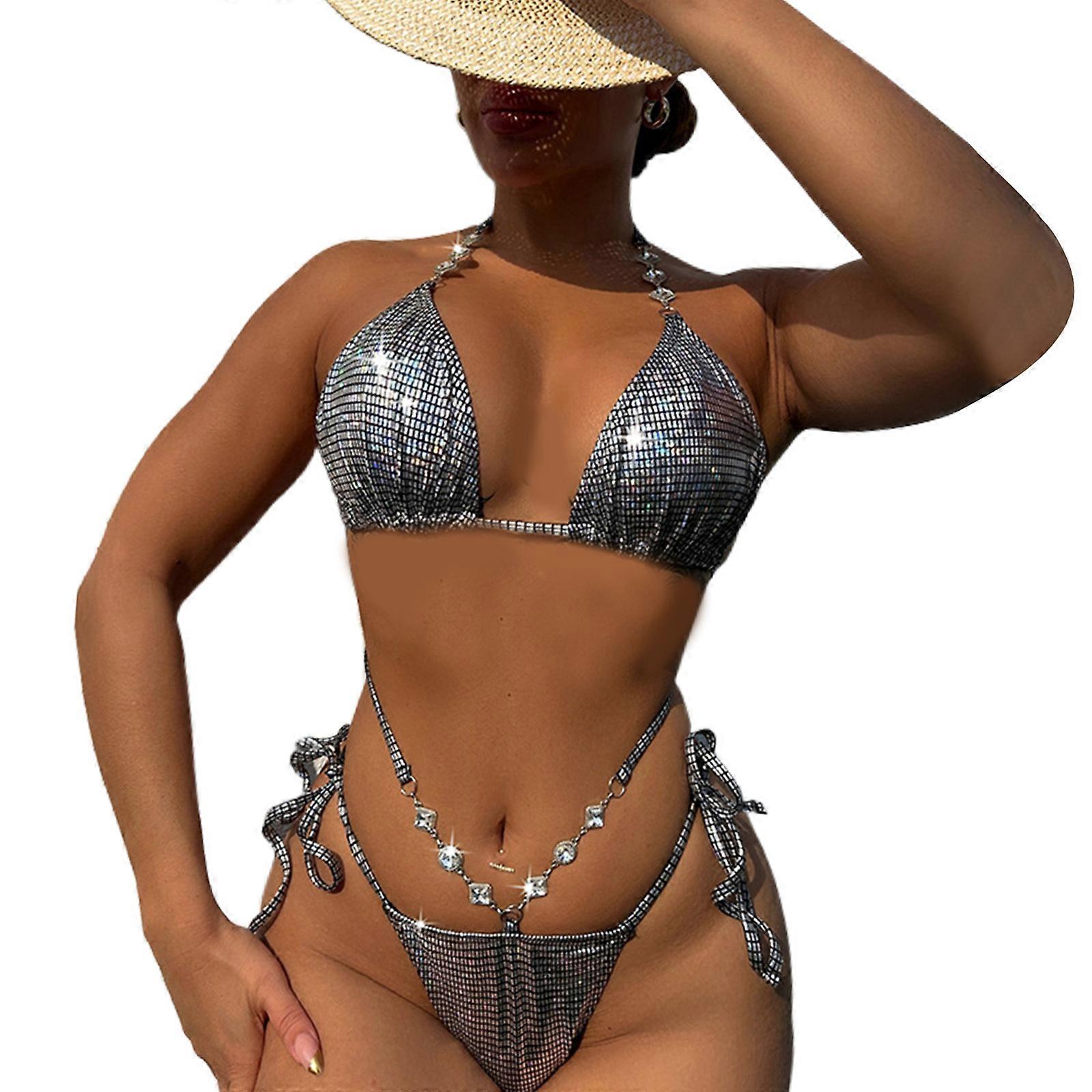 Women Swimwears Spaghetti Strap Bathing Suit Swimsuit Set Pools Beach Parties, Halterneck Top and Side Tie Briefs Silver S