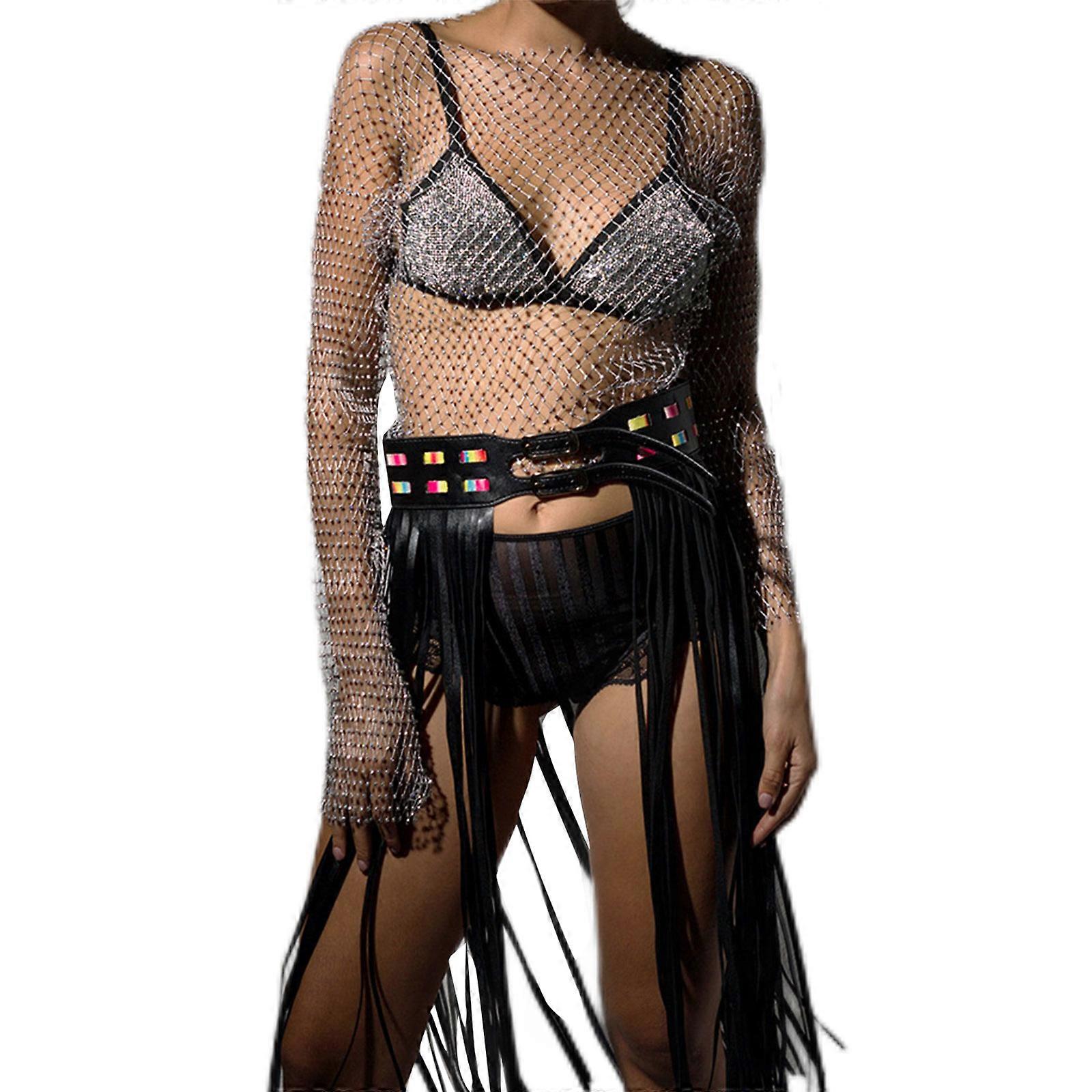 Sexy Women Long Sleeve Mesh Rhinestones Crop Tops Summer Beach Party Cover-ups Shinny See Through Diamond Fishnet Top Round neck silver S