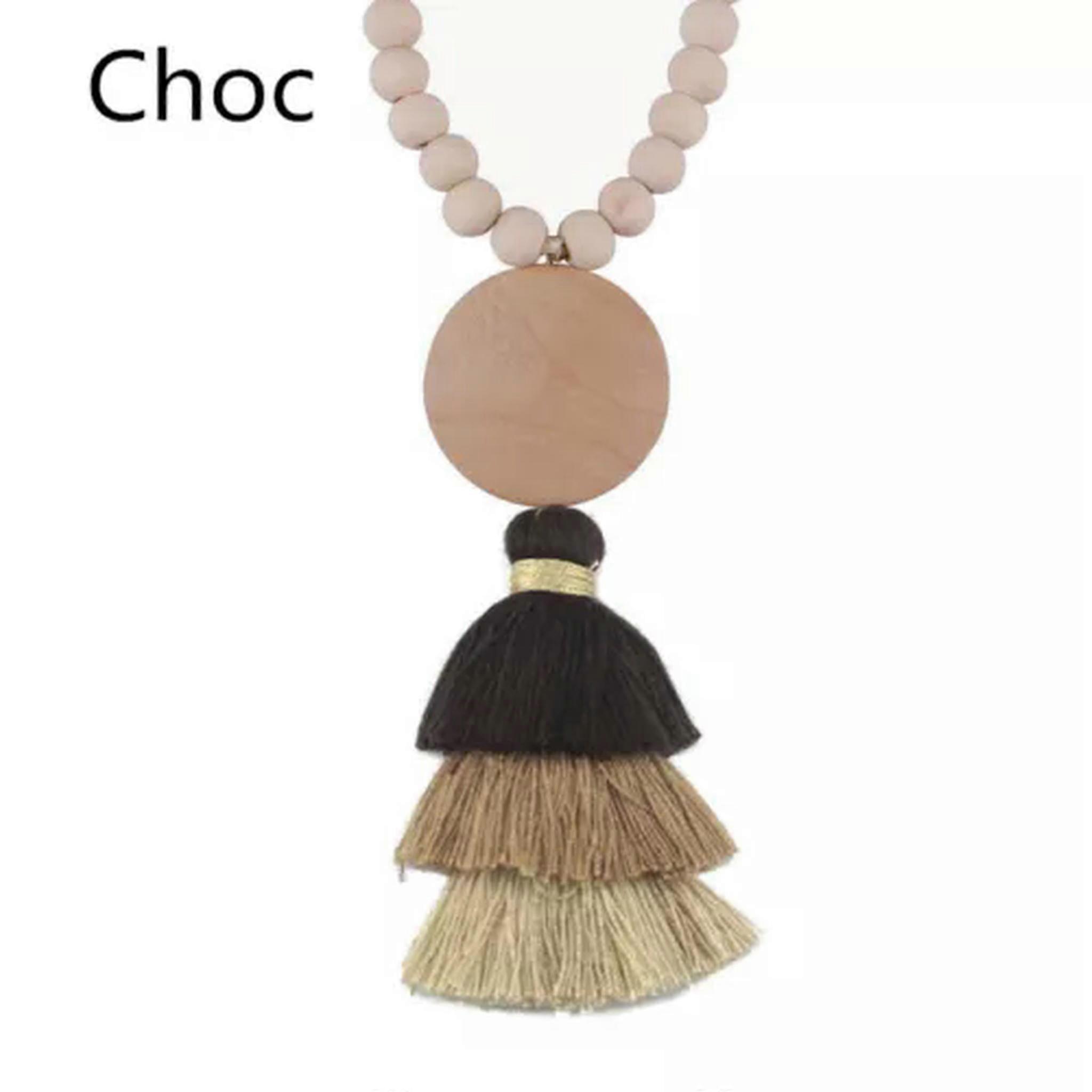 RSAMD Monogram Blank Wooden Disc CottonTassel Pendant Necklace10mm Wood Beaded Chain-Choc