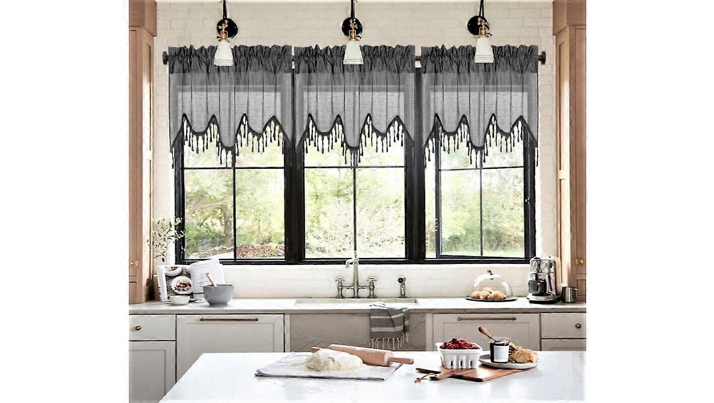 Wave Charcoal color waterfall valance with tassels faux silk rod pocket semisheer ascot dressing window 55" wide X 18" long for kitchen décor