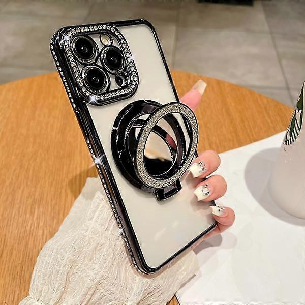 RYI_Transparent Magnetic Glitter Flip Makeup Mirror Holder Phone Case Compatible with iPhone 16 15 14plus Promax black for compatible with iPhone 16